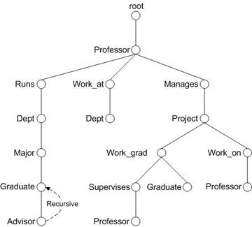 Return count($a/professor) + count($a//dept) + count($a//graduate) + count($a//project)